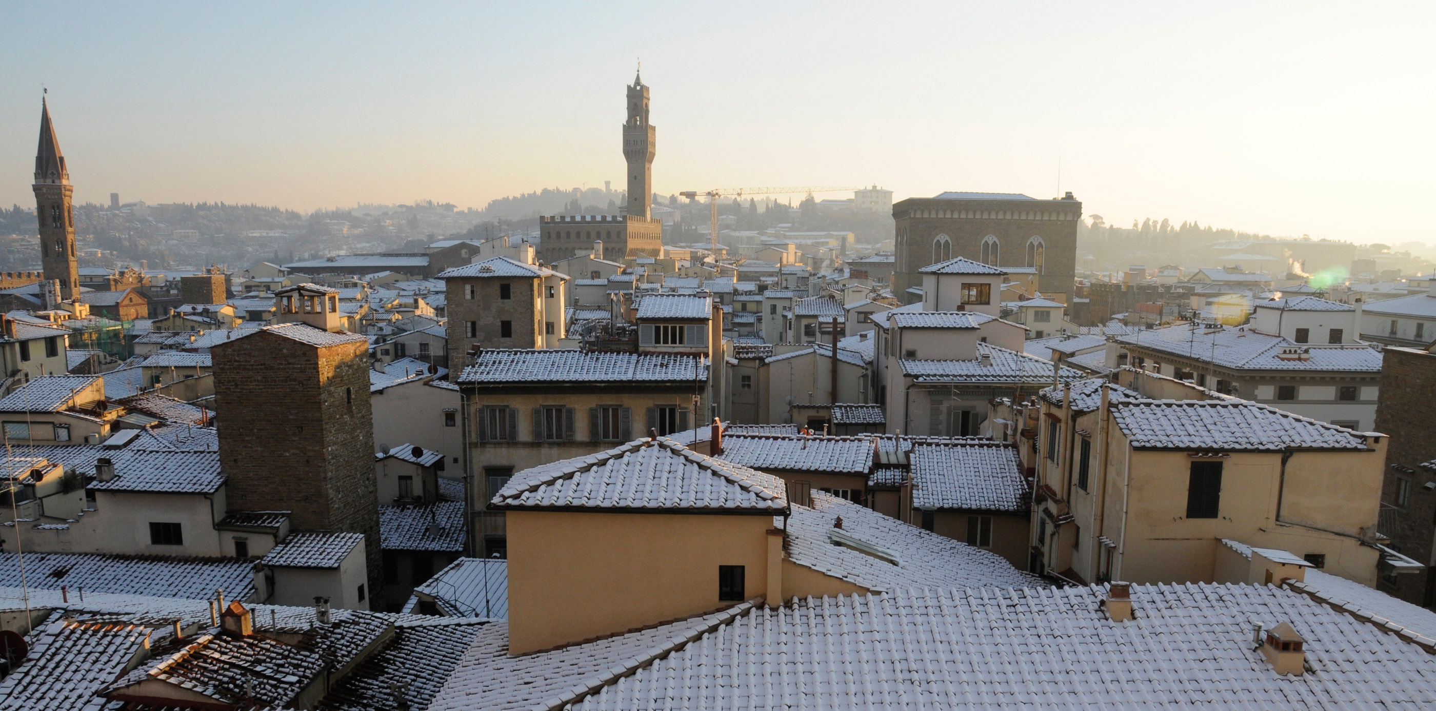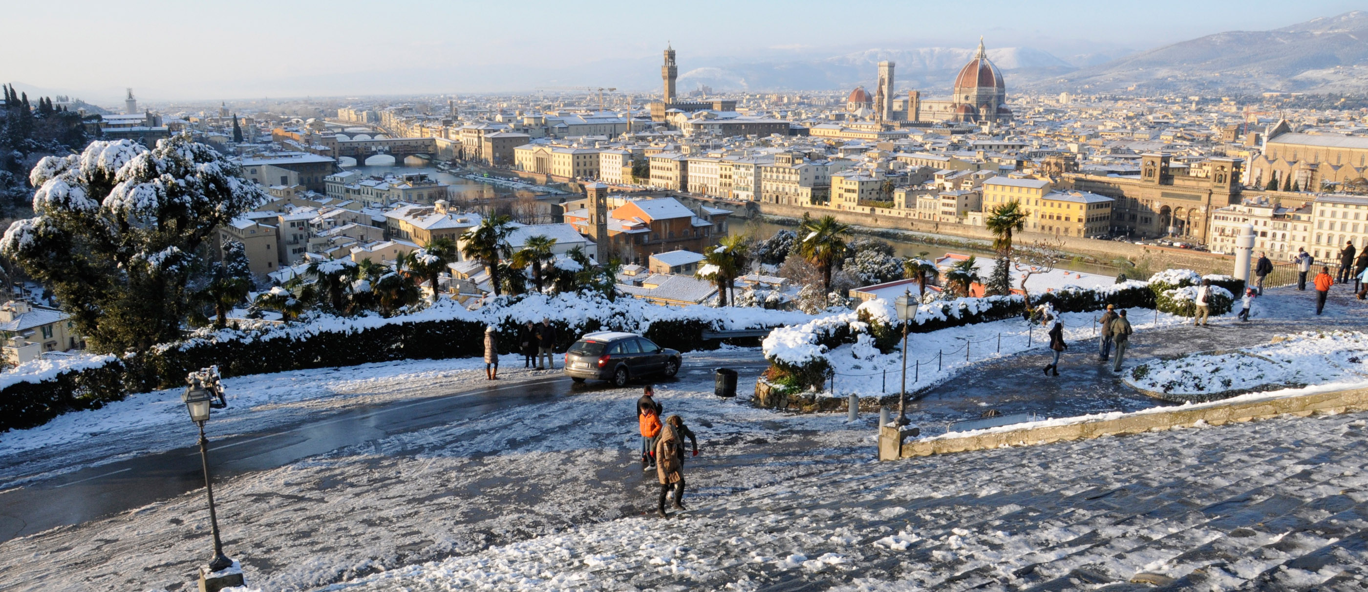 A temperate valley position ensures it never, ever snows in Florence. Except this time. Morning revealed a city decked in snow and sunshine under a crisp, cold sky.