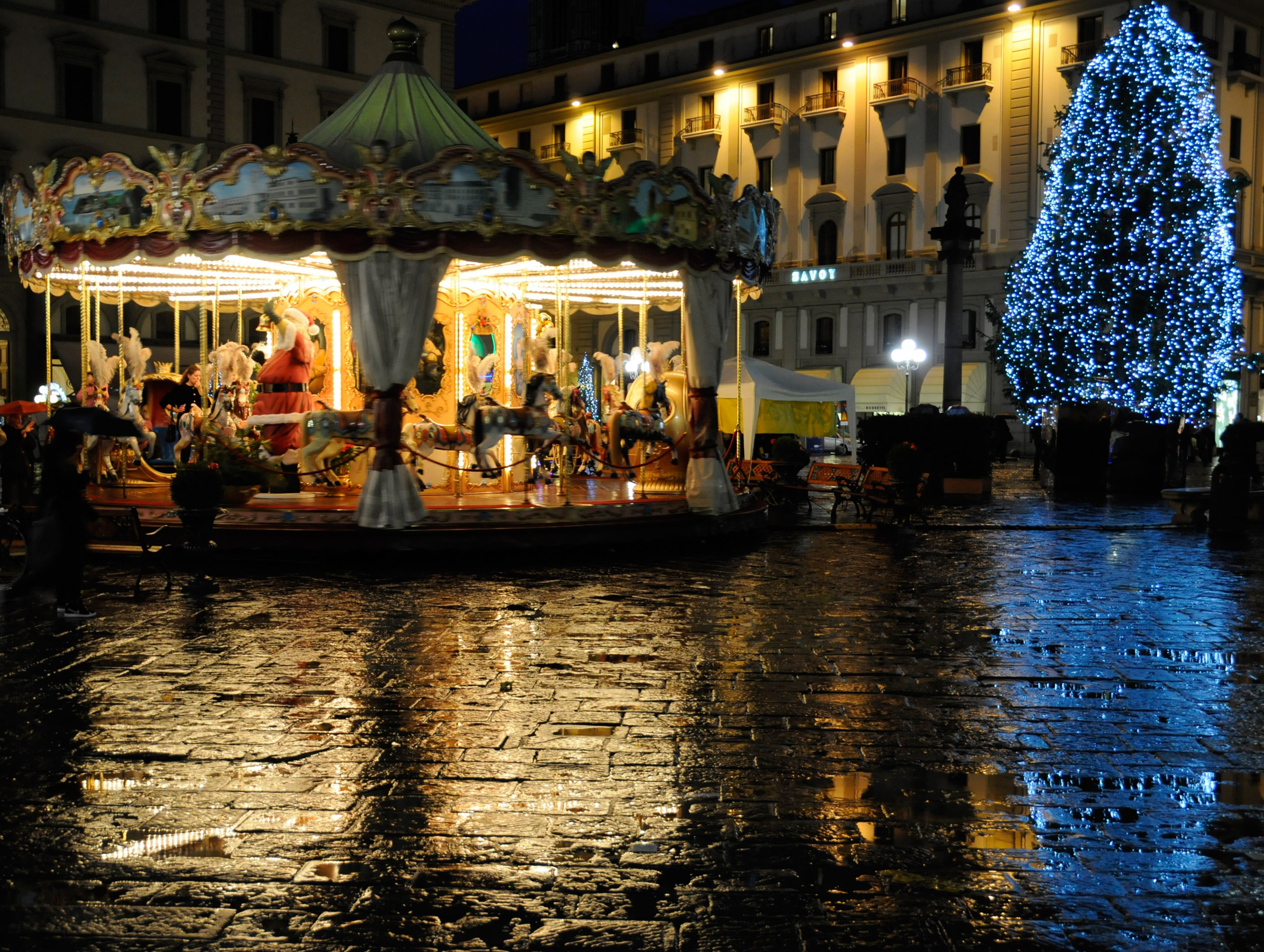 The Christmas eve shopping eventually drizzles to a close, the carousel and Christmas tree in the Piazza Strozzi did their job, alone now that everyone has cosied off home.